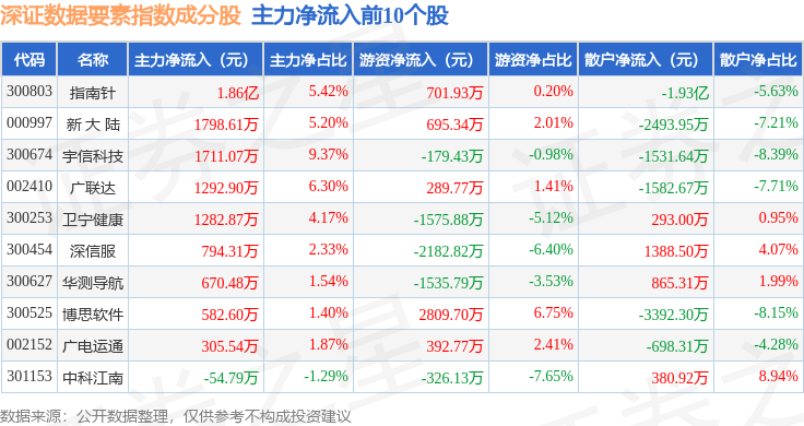 资金流向方面,深证数据要素(970053)指数成份股当日主力资金净流出合计22.8亿元,游资资金净流入合计2.83亿元,散户资金净流入合计19.96亿元。成份股资金流向详情见下表: