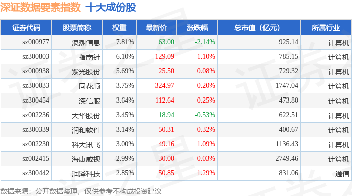 证券之星消息,12月10日,深证数据要素(970053)指数报收于3834.48点,跌0.37%,成交398.23亿元,换手率2.4%。当日该指数成份股中,上涨的有27家,新大陆以1.84%的涨幅领涨,下跌的有22家,航天发展以6.28%的跌幅领跌。