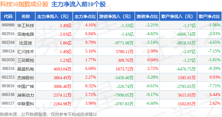 资金流向方面,科技50(970080)指数成份股当日主力资金净流出合计40.83亿元,游资资金净流入合计6.44亿元,散户资金净流入合计34.39亿元。成份股资金流向详情见下表: