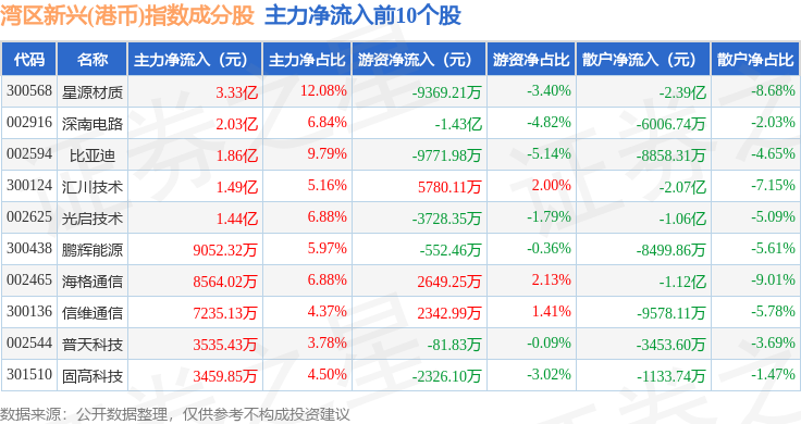 资金流向方面,湾区新兴(港币)(980008)指数成份股当日主力资金净流出合计46.39亿元,游资资金净流入合计5.57亿元,散户资金净流入合计40.82亿元。成份股资金流向详情见下表:
