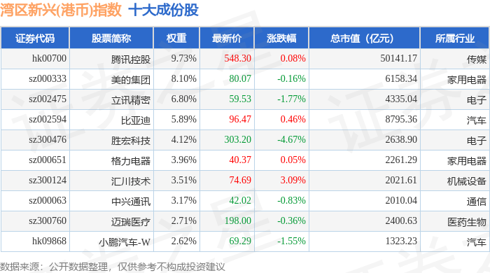 湾区新兴(港币)(980008)指数十大成份股详情如下: