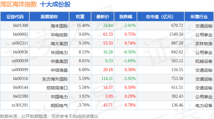 湾区海洋(980019)指数十大成份股详情如下: