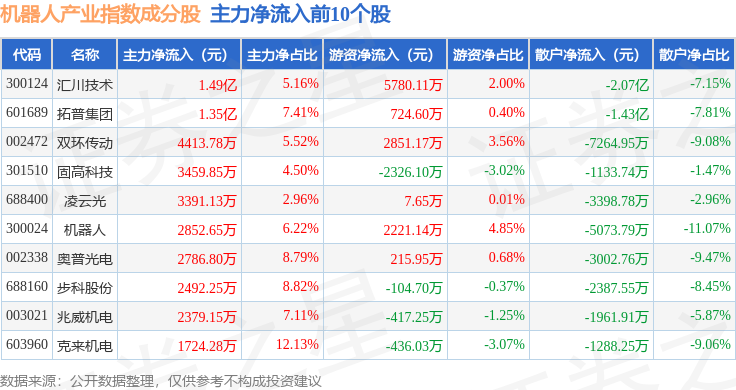 资金流向方面,机器人产业(980022)指数成份股当日主力资金净流入合计7514.99万元,游资资金净流入合计2.25亿元,散户资金净流出合计2.75亿元。成份股资金流向详情见下表: