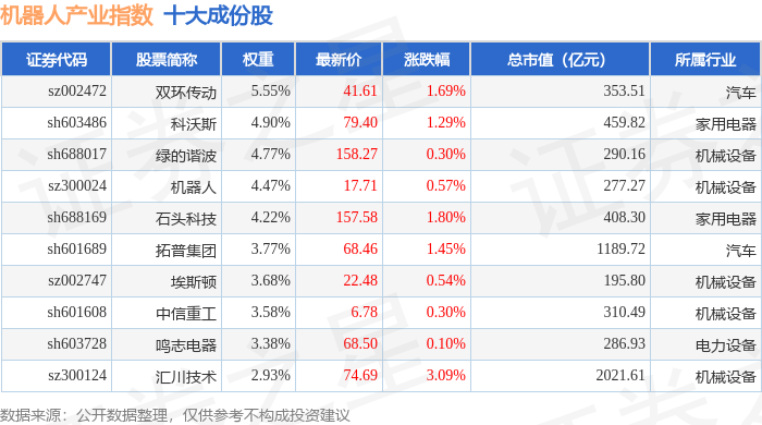 机器人产业(980022)指数十大成份股详情如下: