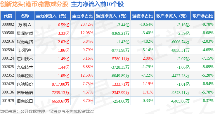 资金流向方面,创新龙头(港币)(980037)指数成份股当日主力资金净流出合计24.95亿元,游资资金净流出合计1.53亿元,散户资金净流入合计26.48亿元。成份股资金流向详情见下表: