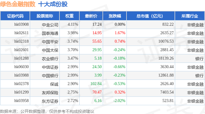 绿色金融(980052)指数十大成份股详情如下: