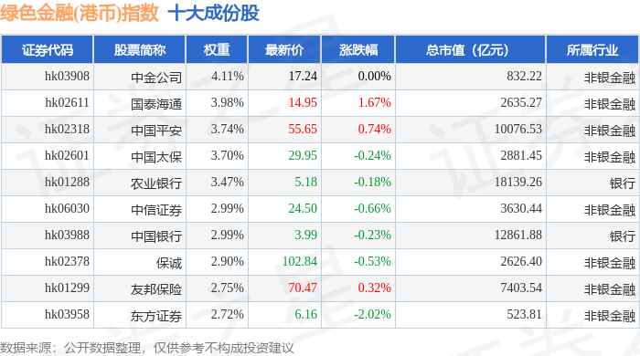 绿色金融(港币)(980053)指数十大成份股详情如下:
