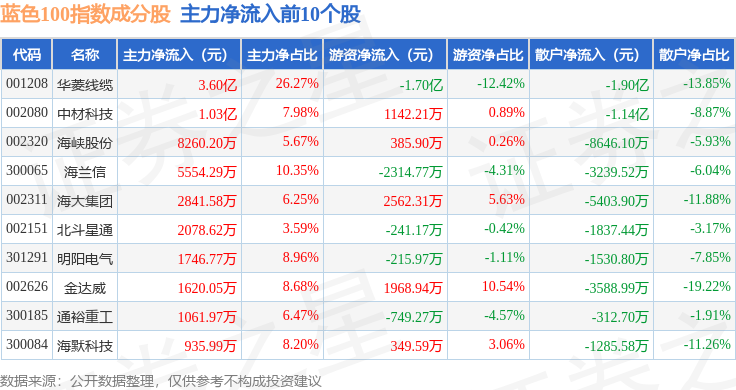 资金流向方面,蓝色100(980068)指数成份股当日主力资金净流出合计16.32亿元,游资资金净流入合计3.78亿元,散户资金净流入合计12.54亿元。成份股资金流向详情见下表: