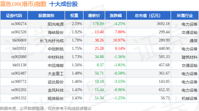 蓝色100(港币)(980069)指数十大成份股详情如下: