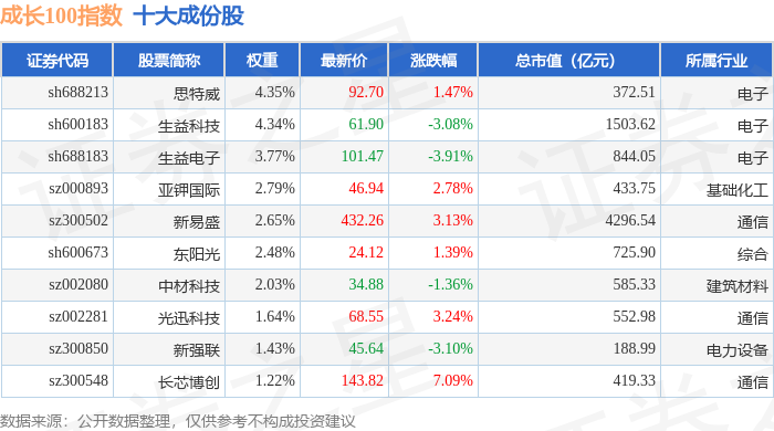 证券之星消息,12月10日,成长100(980080)指数报收于9740.76点,涨0.01%,成交1236.0亿元,换手率2.05%。当日该指数成份股中,上涨的有46家,长芯博创以7.09%的涨幅领涨,下跌的有52家,吉林碳谷以5.62%的跌幅领跌。