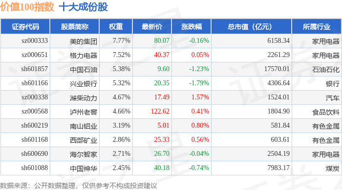 证券之星消息,12月10日,价值100(980081)指数报收于4347.77点,涨0.02%,成交386.11亿元,换手率0.62%。当日该指数成份股中,上涨的有57家,大商股份以7.23%的涨幅领涨,下跌的有43家,齐鲁银行以2.23%的跌幅领跌。