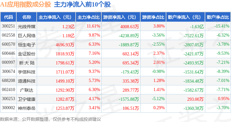 资金流向方面,AI应用(980112)指数成份股当日主力资金净流出合计12.07亿元,游资资金净流入合计2.69亿元,散户资金净流入合计9.38亿元。成份股资金流向详情见下表: