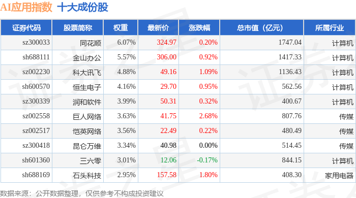 近10日内AI应用(980112)指数成份股做了调整,新纳入了3只股票,剔除了3只股票。