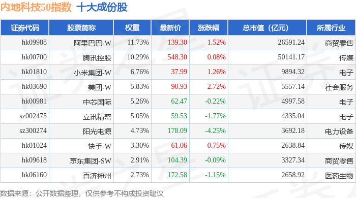证券之星消息,12月10日,内地科技50(983003)指数报收于2964.95点,跌0.2%,成交852.36亿元,换手率1.04%。当日该指数成份股中,上涨的有30家,贝壳-W以4.32%的涨幅领涨,下跌的有20家,阳光电源以4.25%的跌幅领跌。