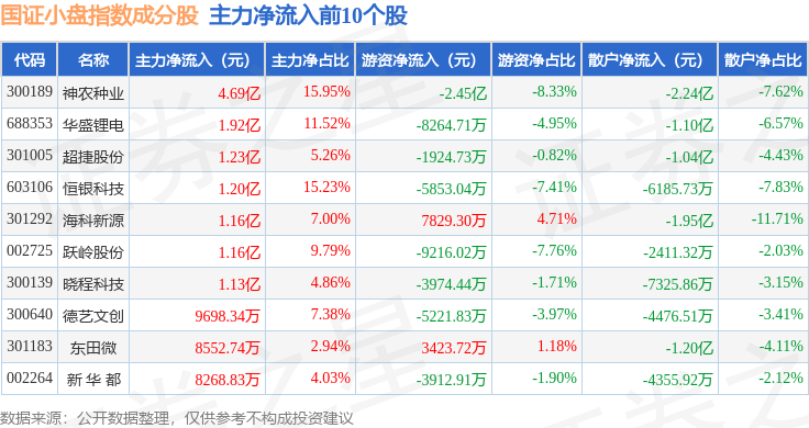 资金流向方面,国证小盘(980202)指数成份股当日主力资金净流出合计20.25亿元,游资资金净流入合计4.13亿元,散户资金净流入合计11.14亿元。成份股资金流向详情见下表: