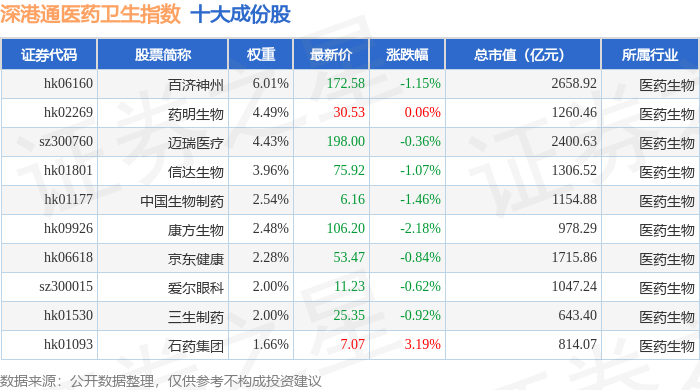 深港通医药卫生(983023)指数十大成份股详情如下: