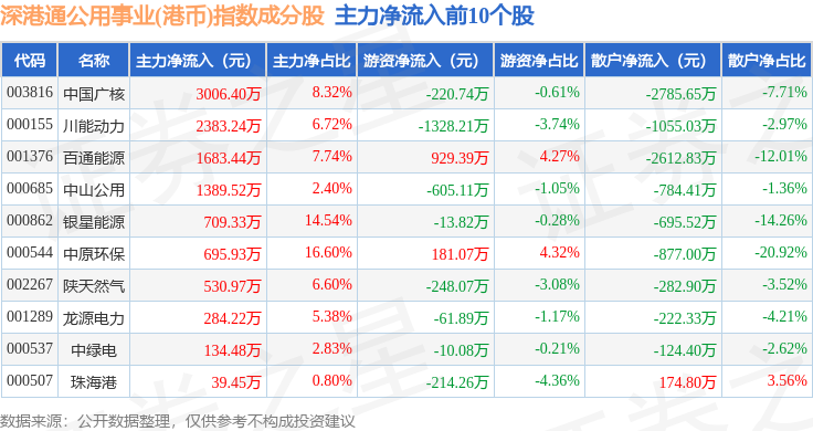 资金流向方面,深港通公用事业(港币)(983032)指数成份股当日主力资金净流出合计2.05亿元,游资资金净流入合计1641.66万元,散户资金净流入合计1.89亿元。成份股资金流向详情见下表: