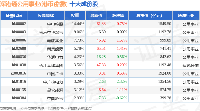 深港通公用事业(港币)(983032)指数十大成份股详情如下: