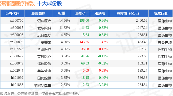 证券之星消息,12月10日,深港通医疗(983035)指数报收于4415.21点,跌0.41%,成交69.72亿元,换手率0.9%。当日该指数成份股中,上涨的有21家,可孚医疗以4.14%的涨幅领涨,下跌的有36家,先健科技以9.14%的跌幅领跌。