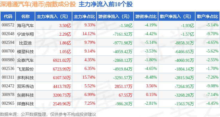 资金流向方面,深港通汽车(港币)(983040)指数成份股当日主力资金净流入合计8270.46万元,游资资金净流出合计4.47亿元,散户资金净流入合计3.64亿元。成份股资金流向详情见下表: