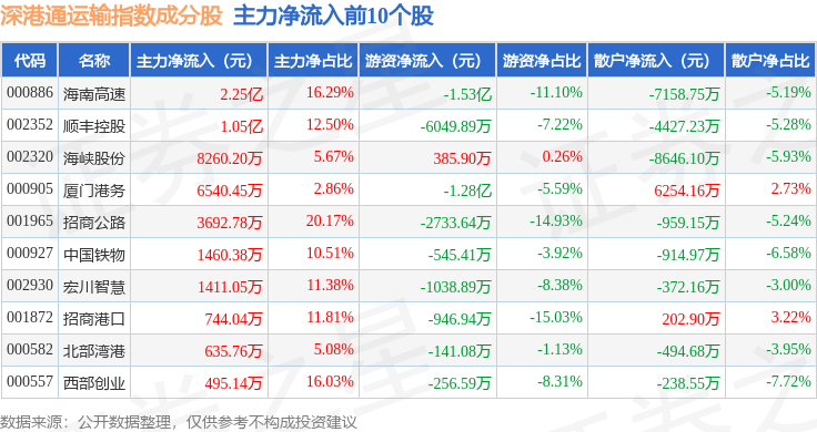 资金流向方面,深港通运输(983077)指数成份股当日主力资金净流入合计4.77亿元,游资资金净流出合计3.9亿元,散户资金净流出合计8612.26万元。成份股资金流向详情见下表: