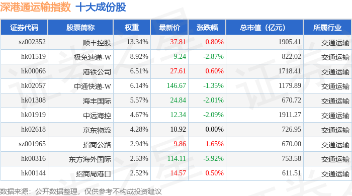 证券之星消息,12月10日,深港通运输(983077)指数报收于4339.64点,跌0.44%,成交101.55亿元,换手率0.66%。当日该指数成份股中,上涨的有34家,厦门港务以9.99%的涨幅领涨,下跌的有22家,太平洋航运以6.82%的跌幅领跌。