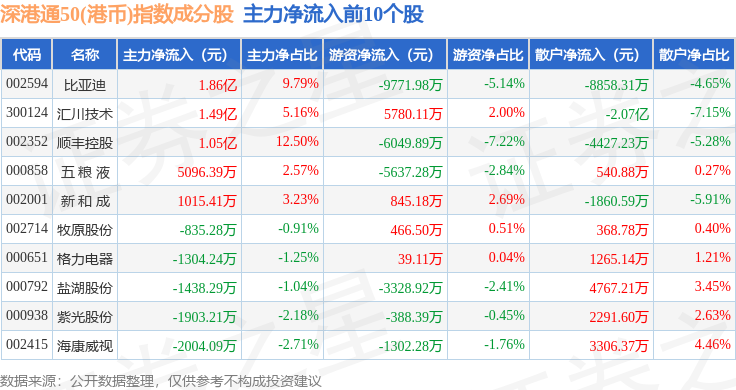 资金流向方面,深港通50(港币)(983092)指数成份股当日主力资金净流出合计36.67亿元,游资资金净流入合计9.84亿元,散户资金净流入合计26.83亿元。成份股资金流向详情见下表: