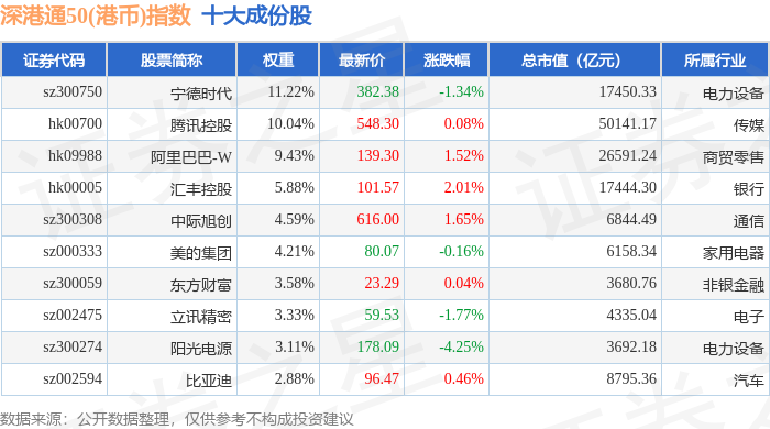 深港通50(港币)(983092)指数十大成份股详情如下: