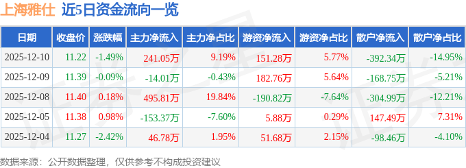 证券之星消息,截至2025年12月10日收盘,上海雅仕(603329)报收于11.22元,下跌1.49%,换手率1.13%,成交量2.33万手,成交额2624.1万元。