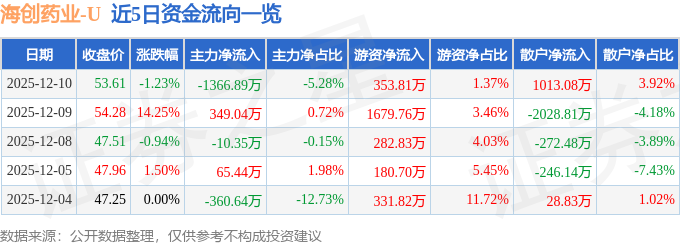 证券之星消息,截至2025年12月10日收盘,海创药业(688302)报收于53.61元,下跌1.23%,换手率4.85%,成交量4.8万手,成交额2.59亿元。
