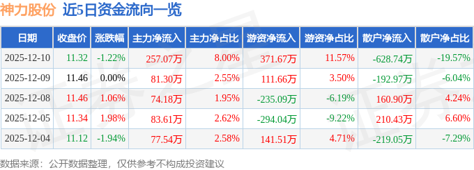 证券之星消息,截至2025年12月10日收盘,神力股份(603819)报收于11.32元,下跌1.22%,换手率1.3%,成交量2.82万手,成交额3212.8万元。