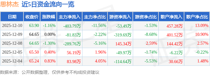 12月10日的资金流向数据方面,主力资金净流出403.79万元,占总成交额11.56%,游资资金净流出53.49万元,占总成交额1.53%,散户资金净流入457.28万元,占总成交额13.09%。