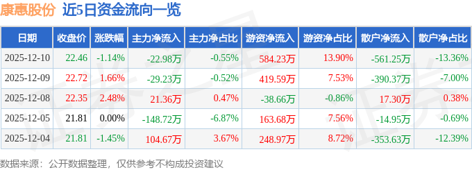 证券之星消息,截至2025年12月10日收盘,康惠股份(603139)报收于22.46元,下跌1.14%,换手率1.86%,成交量1.85万手,成交额4201.79万元。