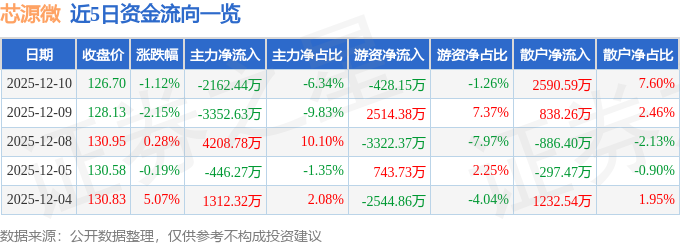 证券之星消息,截至2025年12月10日收盘,芯源微(688037)报收于126.7元,下跌1.12%,换手率1.35%,成交量2.72万手,成交额3.41亿元。