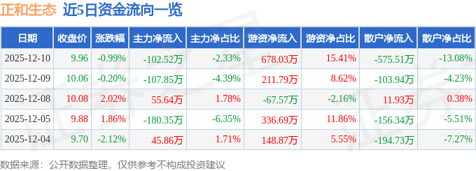 证券之星消息,截至2025年12月10日收盘,正和生态(605069)报收于9.96元,下跌0.99%,换手率5.17%,成交量4.35万手,成交额4398.98万元。