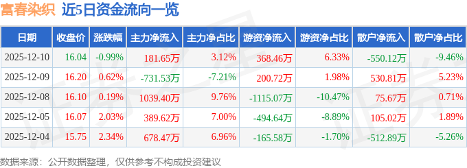 证券之星消息,截至2025年12月10日收盘,富春染织(605189)报收于16.04元,下跌0.99%,换手率1.88%,成交量3.65万手,成交额5818.24万元。