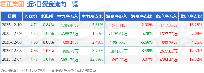 证券之星消息,截至2025年12月10日收盘,君正集团(601216)报收于4.71元,下跌0.84%,换手率0.71%,成交量59.55万手,成交额2.8亿元。