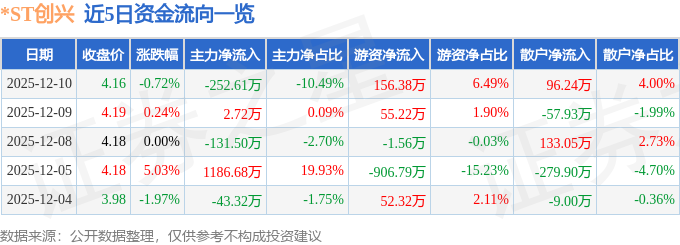 证券之星消息,截至2025年12月10日收盘,*ST创兴(600193)报收于4.16元,下跌0.72%,换手率1.36%,成交量5.8万手,成交额2408.88万元。