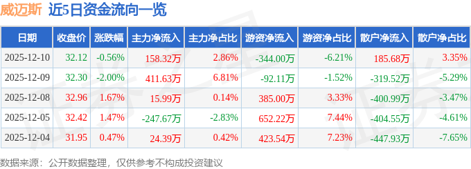 12月10日的资金流向数据方面,主力资金净流入158.32万元,占总成交额2.86%,游资资金净流出344.0万元,占总成交额6.21%,散户资金净流入185.68万元,占总成交额3.35%。