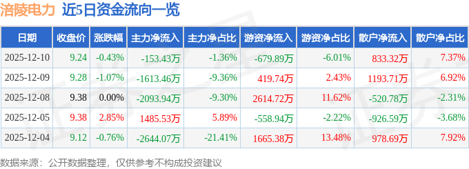 证券之星消息,截至2025年12月10日收盘,涪陵电力(600452)报收于9.24元,下跌0.43%,换手率0.8%,成交量12.22万手,成交额1.13亿元。