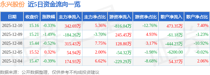 证券之星消息,截至2025年12月10日收盘,永兴股份(601033)报收于15.16元,下跌0.33%,换手率1.76%,成交量4.22万手,成交额6397.07万元。