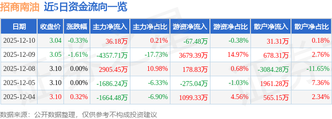 证券之星消息,截至2025年12月10日收盘,招商南油(601975)报收于3.04元,下跌0.33%,换手率1.21%,成交量58.01万手,成交额1.76亿元。