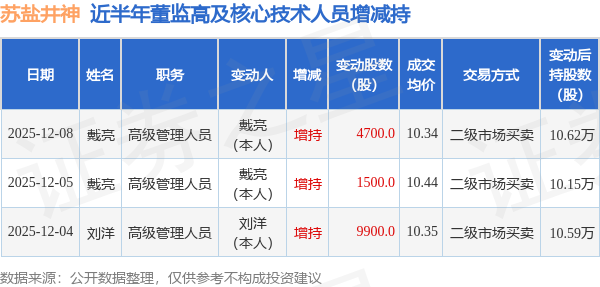证券之星消息,根据12月10日市场公开信息、上市公司公告及交易所披露数据整理,苏盐井神(603299)最新董监高及相关人员股份变动情况:2025年12月4日至2025年12月8日公司高级管理人员刘洋、高级管理人员戴亮共增持公司股份1.61万股,占公司总股本为0.0021%。变动期间公司股价下跌0.87%,12月8日当日收盘报10.31元。