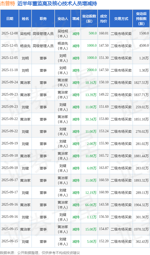 杰普特近半年内的董监高及核心技术人员增减持详情如下: