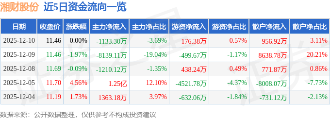 证券之星消息,截至2025年12月10日收盘,湘财股份(600095)报收于11.46元,上涨0.0%,换手率0.94%,成交量26.9万手,成交额3.07亿元。
