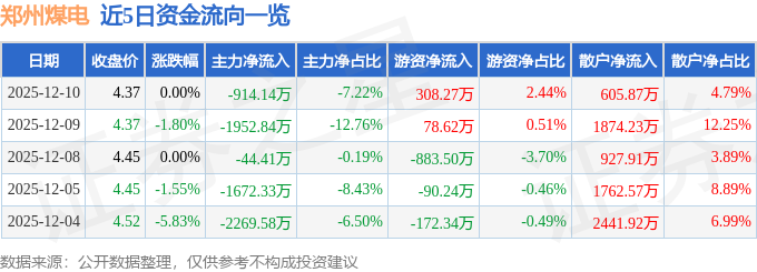 证券之星消息,截至2025年12月10日收盘,郑州煤电(600121)报收于4.37元,上涨0.0%,换手率2.38%,成交量28.96万手,成交额1.27亿元。