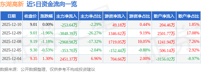证券之星消息,截至2025年12月10日收盘,东湖高新(600133)报收于9.01元,上涨0.0%,换手率1.15%,成交量12.27万手,成交额1.11亿元。