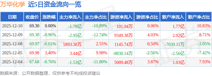 证券之星消息,截至2025年12月10日收盘,万华化学(600309)报收于69.3元,上涨0.0%,换手率0.76%,成交量23.84万手,成交额16.36亿元。
