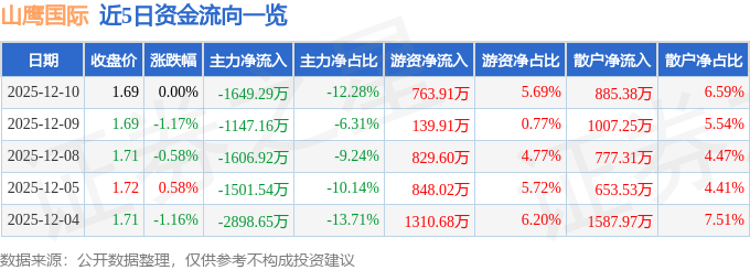 证券之星消息,截至2025年12月10日收盘,山鹰国际(600567)报收于1.69元,上涨0.0%,换手率1.37%,成交量79.7万手,成交额1.34亿元。