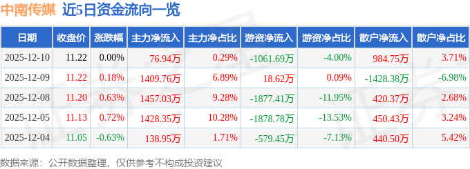 证券之星消息,截至2025年12月10日收盘,中南传媒(601098)报收于11.22元,上涨0.0%,换手率1.31%,成交量23.59万手,成交额2.65亿元。